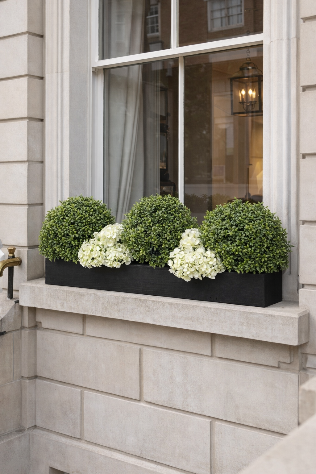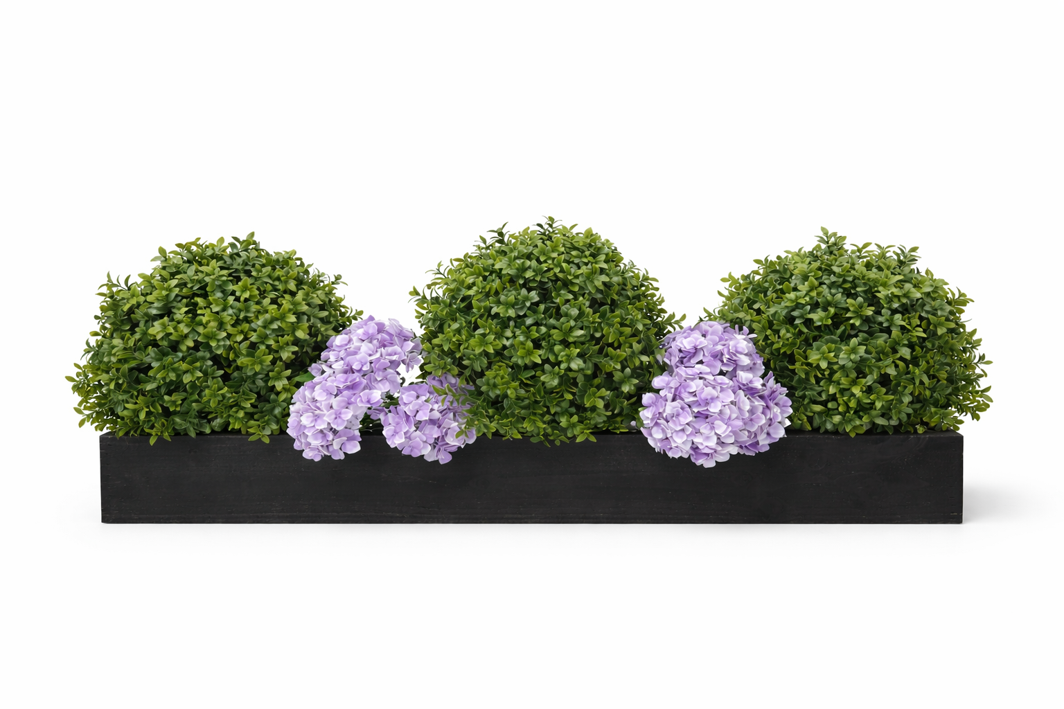 The Artificial Buxus and Bloom Window Box features a beautifully layered, garden-inspired arrangement designed to bring timeless elegance and structure to any windowsill, balcony, patio, or exterior space. At the centre, a tall sculpted Buxus topiary ball creates a striking focal point, adding height and a refined, formal touch, while surrounding rounded boxwood-style bushes provide a dense, vibrant green base for balance and symmetry.