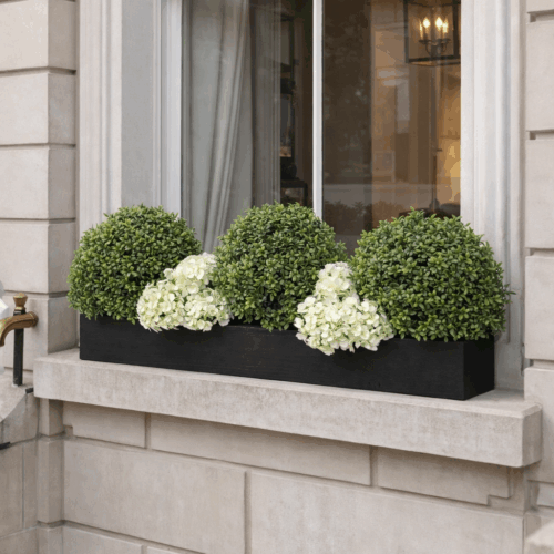 The Artificial Grosvenor Window Box is a classic, garden-inspired display designed to bring vibrant colour and structure to windowsills, balconies, patios, or exterior spaces. Each window box features a matte black wooden planter filled with dense, rounded green foliage that forms a lush, polished base.