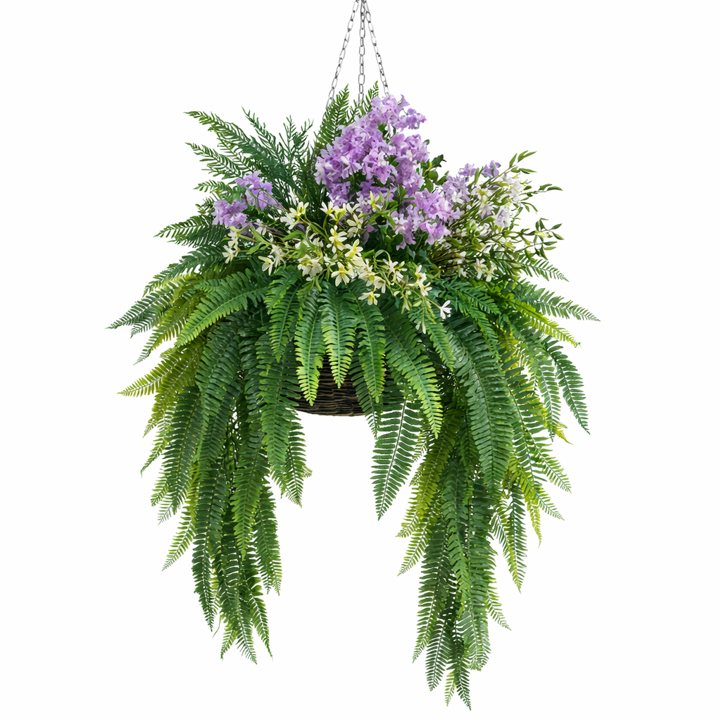 • Realistic hanging basket with tropical ferns and bold lilac flowers