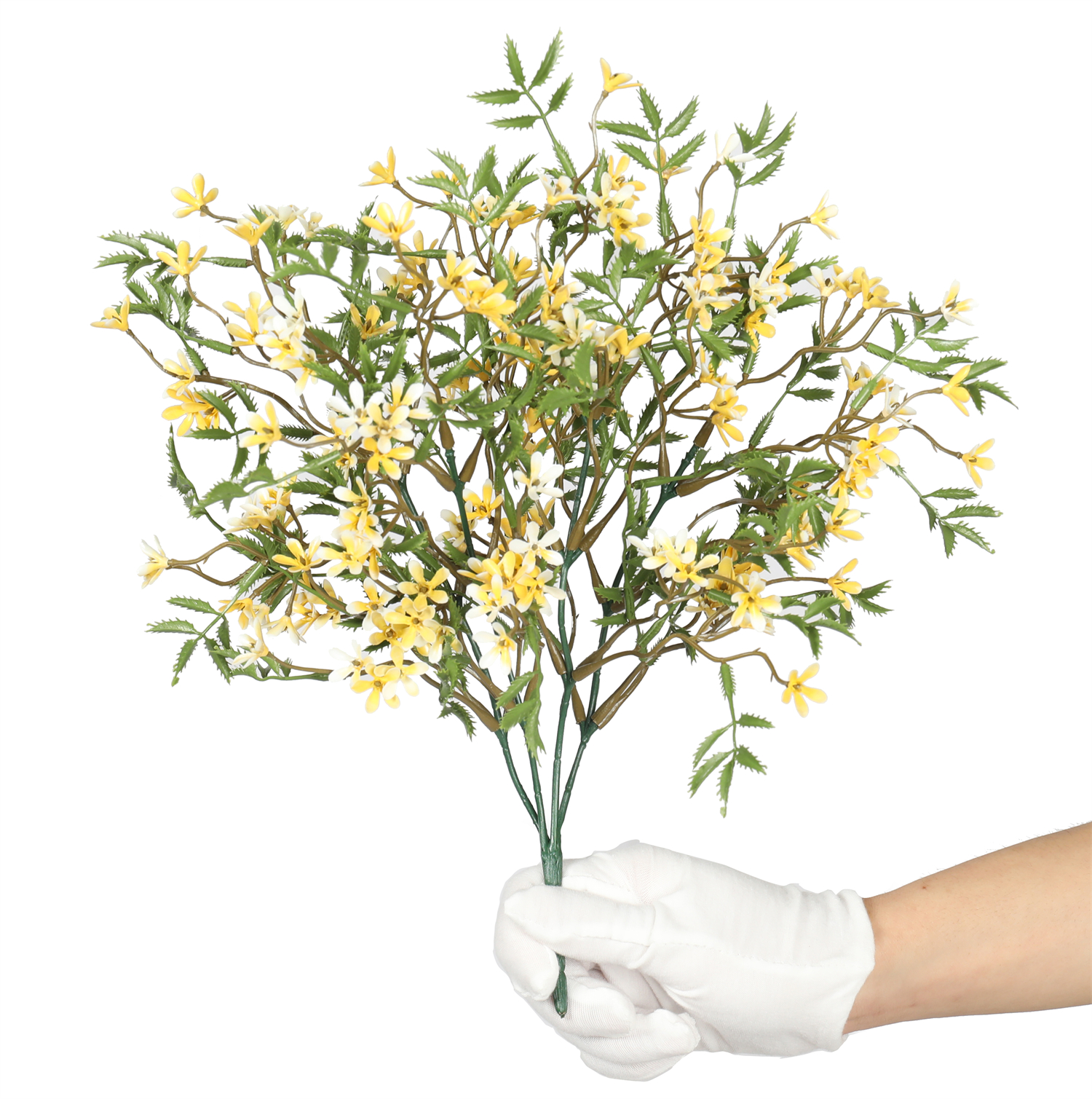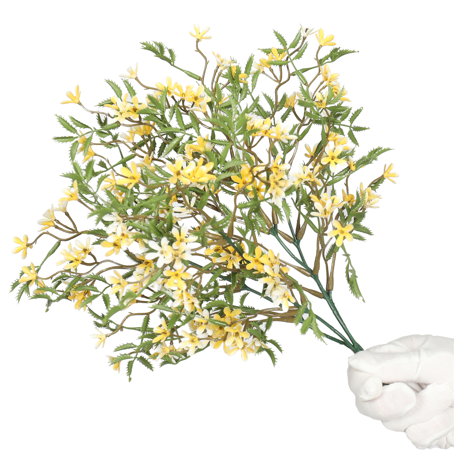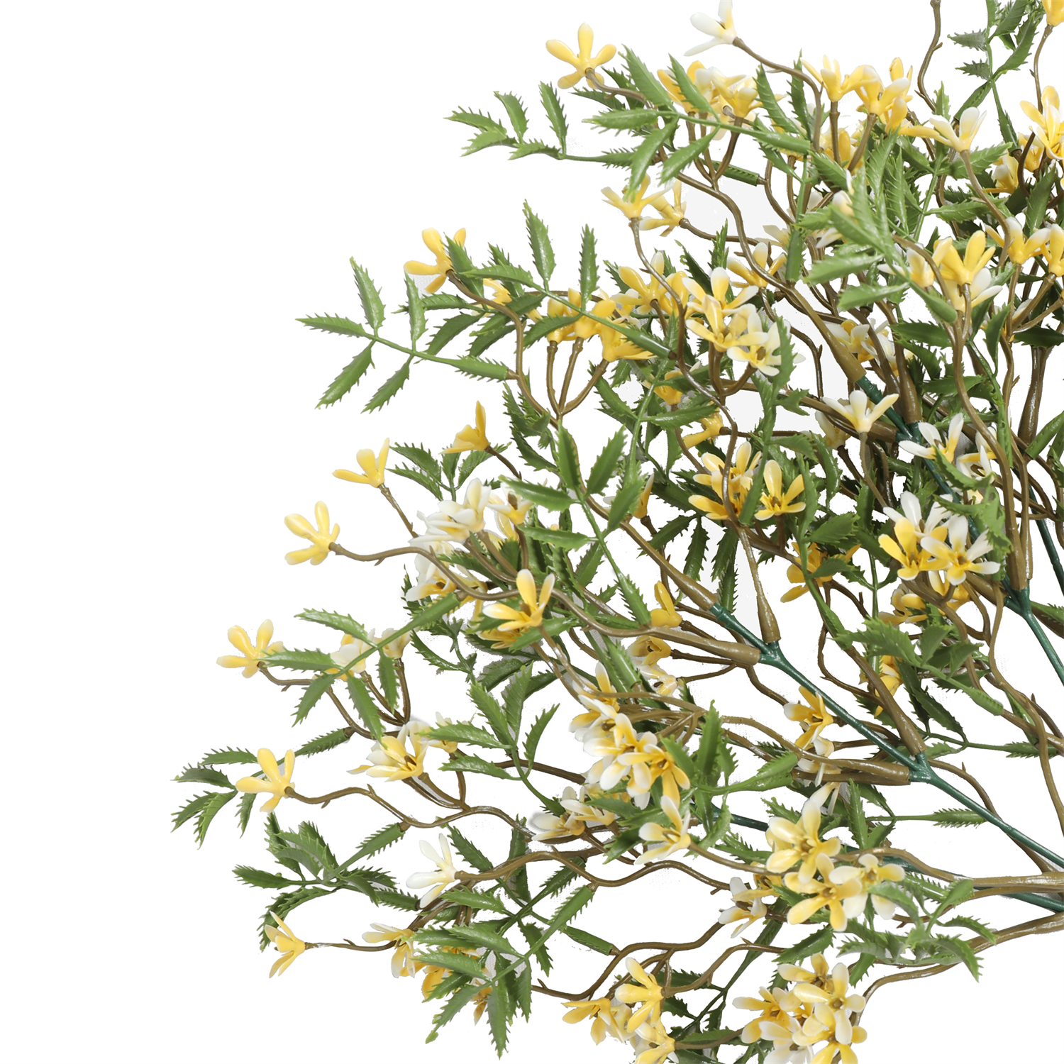 This artificial Flowering Yellow Star stem is 38cm tall from the bottom of the stem to the tip of the foliage. It features small yellow and white star shaped flowers with fine green leaves, giving a bright, natural finish that works well in both indoor and outdoor settings.