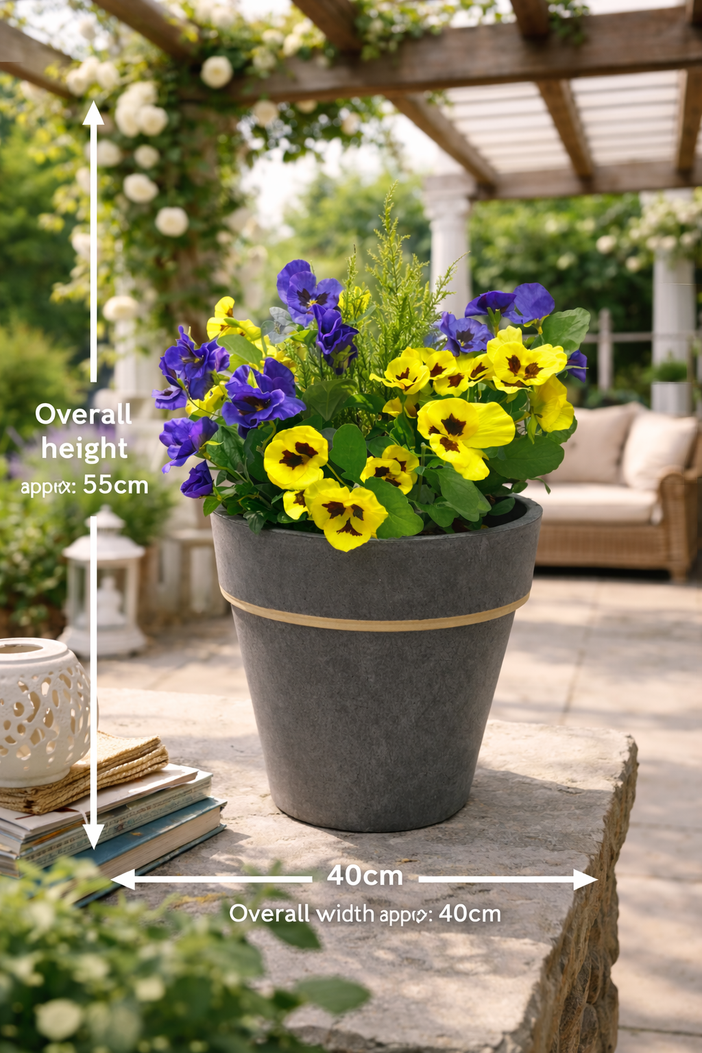 Meet our stunning Artificial Colourful Pansy Plant Pot . Expertly made in the UK, this sophisticated 55cm arrangement is a seamless blend of lifelike Conifer & Pansy Flowers, nestled in a small planter. The UV protection ensures a timeless vibrancy, while the low-maintenance design promises effortless beauty. Whether it’s to transform your living room, office, or garden, this exquisite piece artfully marries convenience with natural charm. Experience the allure of everlasting beauty with our Artificial Colourful Pansy Plant Pot . A scenic oasis awaits you.