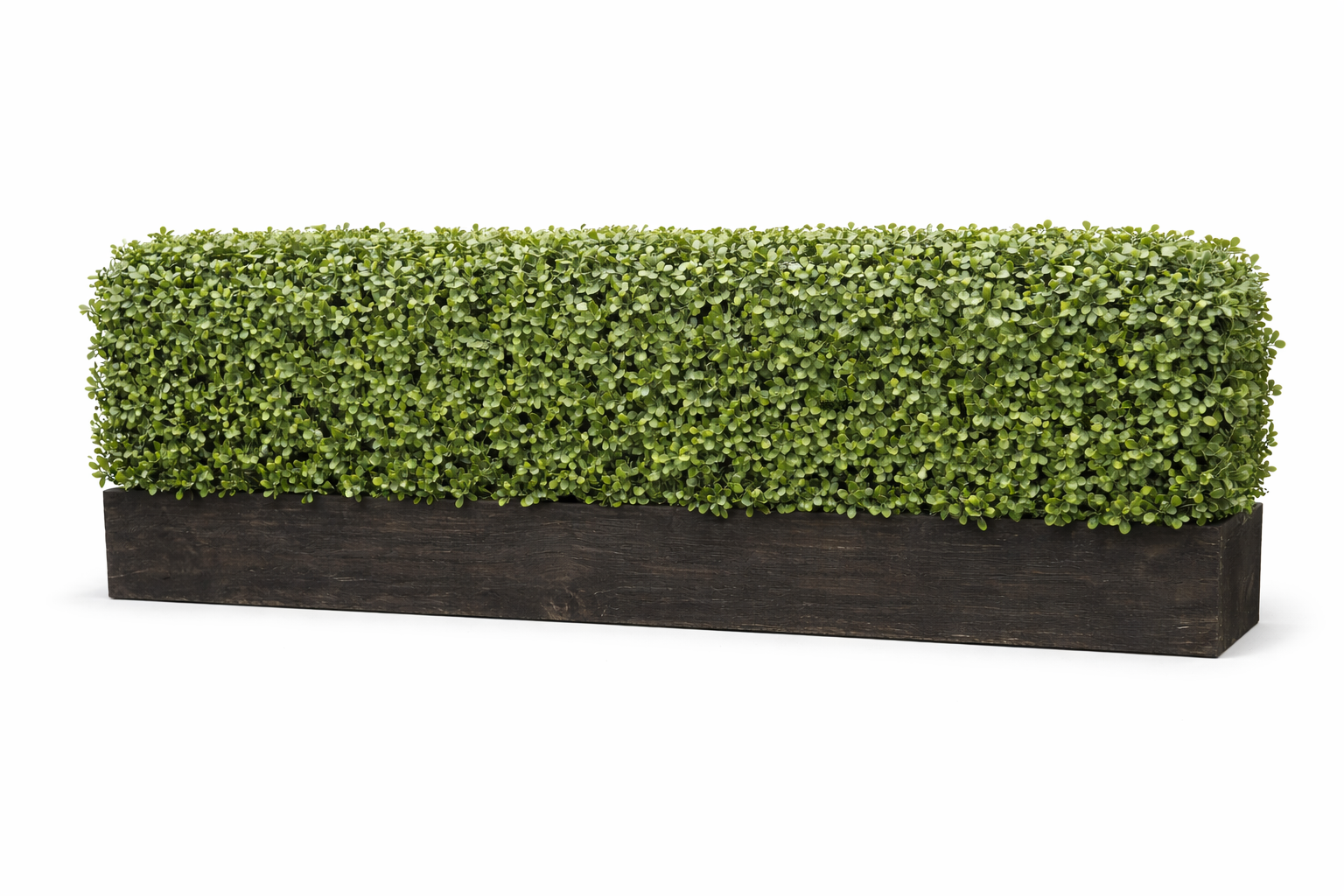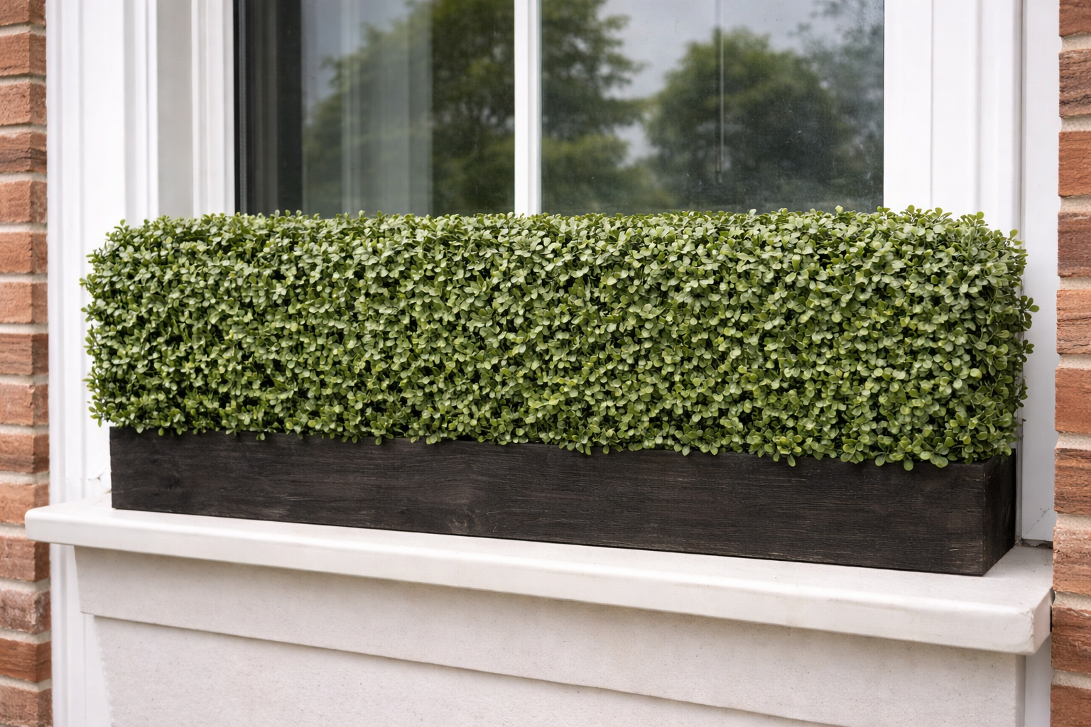 This window box features a sturdy, rectangular planter made from dark, weathered wood with a smooth, matte finish that gives it a timeless, upscale appearance. The planter is filled edge to edge with dense, boxwood-style greenery, carefully arranged to create a full, uniform hedge effect. Each leaf has a realistic shape and natural variation in green tones, adding depth and authenticity to the overall look.