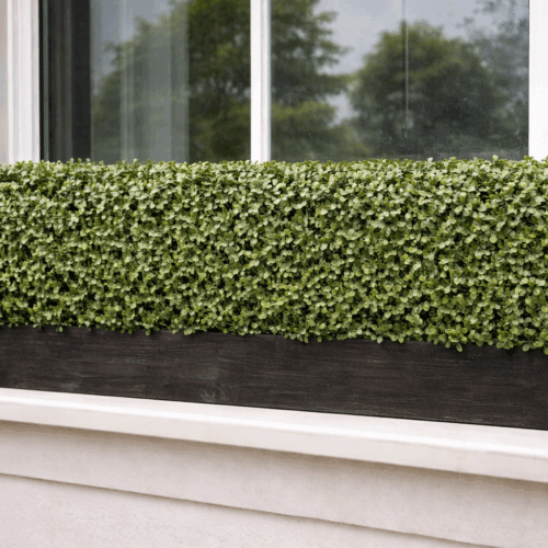 This window box features a long, rectangular planter made from dark, weathered wood, giving it a classic yet slightly rustic look. It’s densely planted for a full, lush appearance, with a balanced mix of textures and heights.